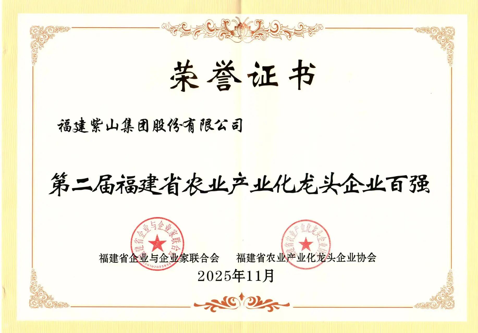 11月27日,福建省企業(yè)與企業(yè)家聯(lián)合會(huì)、福建省農(nóng)業(yè)產(chǎn)業(yè)化龍頭企業(yè)協(xié)會(huì)在福州聯(lián)合發(fā)布第二屆福建省農(nóng)業(yè)產(chǎn)業(yè)化龍頭企業(yè)100強(qiáng)榜單,紫山集團(tuán)憑借卓越的綜合實(shí)力與深厚的產(chǎn)業(yè)根基再次榮耀登榜,榮獲第二屆福建省農(nóng)業(yè)產(chǎn)業(yè)化龍頭企業(yè)100強(qiáng)。
